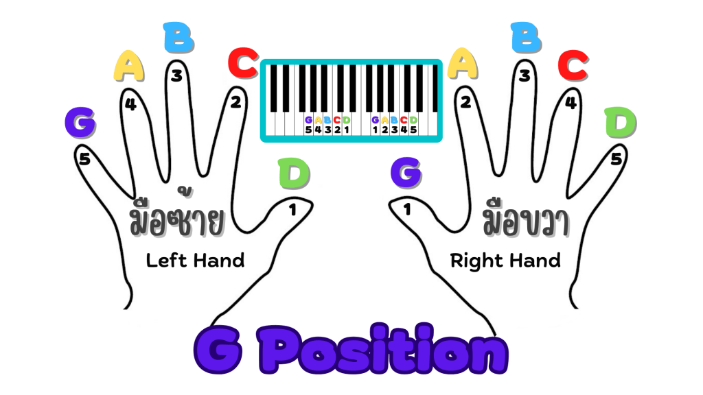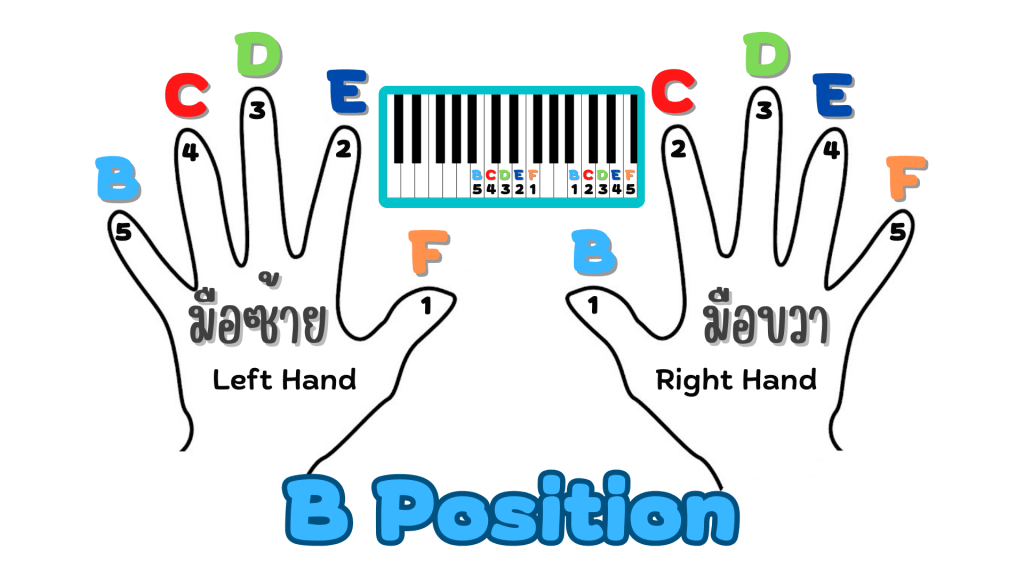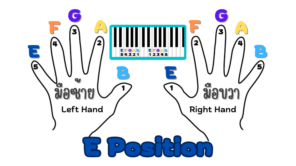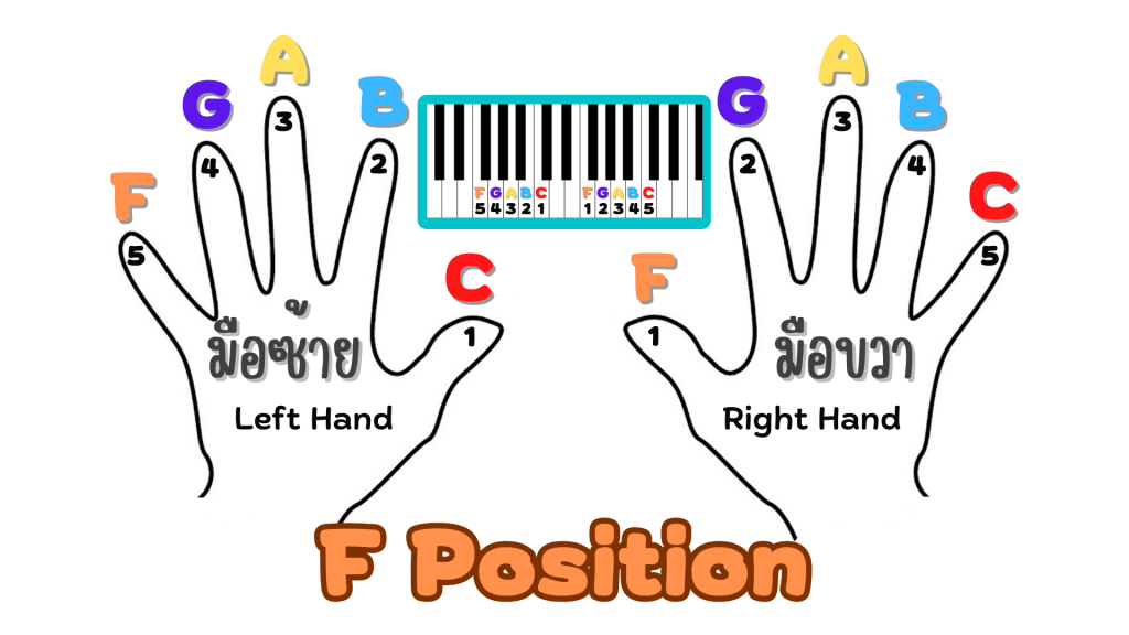 หรือ ถ้าหากนำ นิ้ว 5 ของมือซ้าย และนิ้ว 1 ของมือขวา วางไว้บนโน้ต F ก็จะเรียกตำแหน่งการวางมือนี้ว่า F Position
