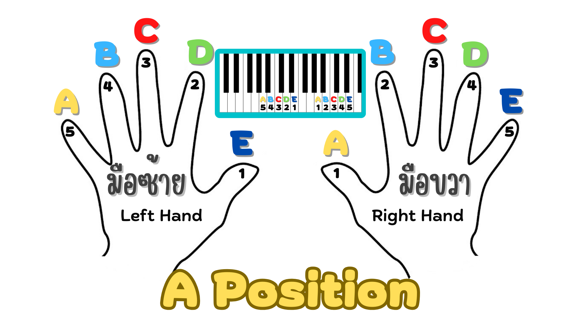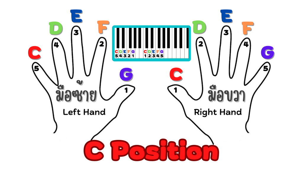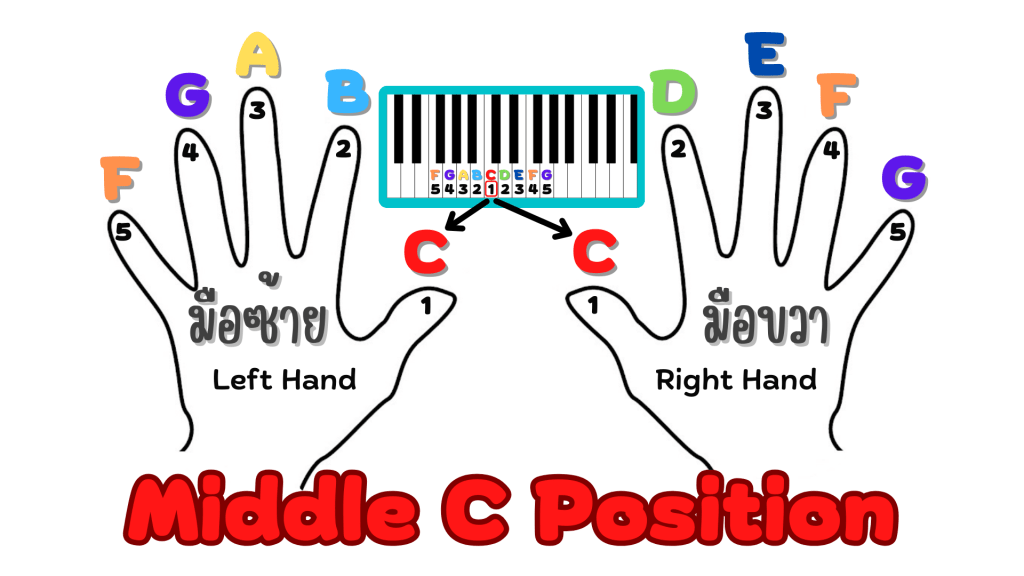 ตัวอย่าง เช่น จากภาพ วางนิ้ว 1 ทั้งมือซ้ายและมือขวาไว้ที่โน้ต C ก็จะเรียก Position นี้ว่า Middle C Position