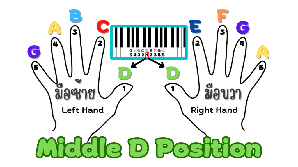 หรือ ถ้าหากวางนิ้ว 1 ทั้ง 2 ข้างรวมกันที่โน้ต D ก็จะเรียกตำแหน่งการวางนิ้วนี้ว่า Middle D Position